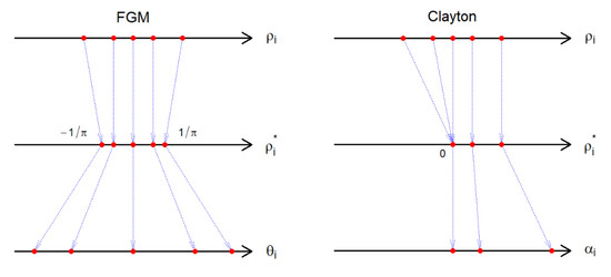 Under this model, the correlation function is for [44]. Thus, the copula parameter is identified by , as long as . If , we suggest or , using , where . Hence, can still be identified by . This boundary enforcement is illustrated in Figure 1.