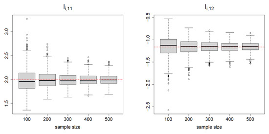 Many copulas have , , and in , such as the normal, FGM, and Clayton copulas (Appendix A.2.). The following theorem gives the formula of the information matrix.