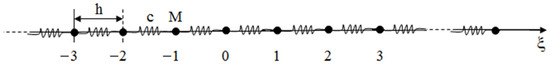 The original discrete object is the Lagrange lattice [47,48,49] (for relevant terminology, see Appendix in [50]). The lattice is that of point masses, , located in equilibrium states at the points of the -axis with coordinates and coupled with elastic springs of stiffness (Figure 1).
