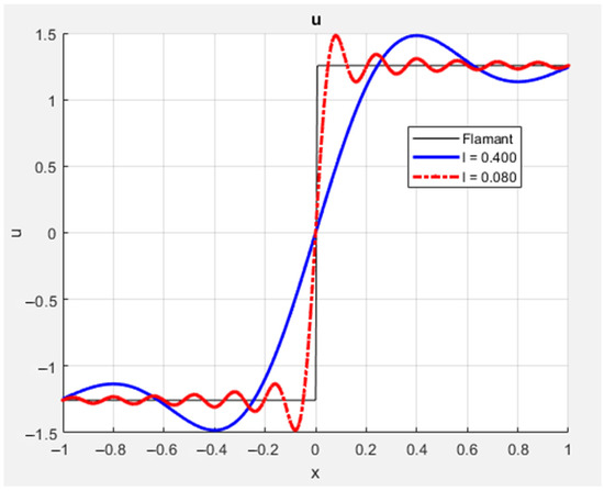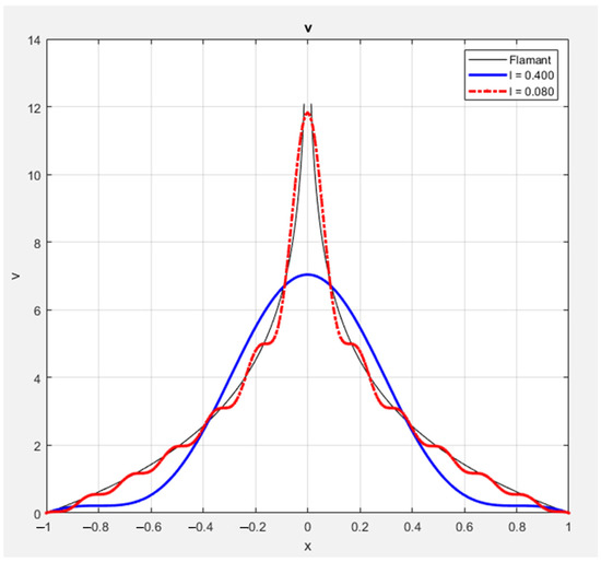 As , formulas (26) and (27) turn into the solution of the Flamant problem, (28) and (29), as expected from general considerations [76,77,78]. Figure 4 demonstrates that the limit transition will not be uniform for the function owing to the familiar Gibbs–Wilbraham phenomenon [79,80].