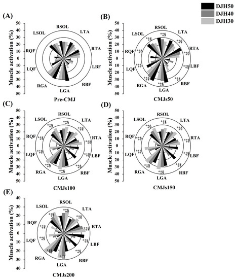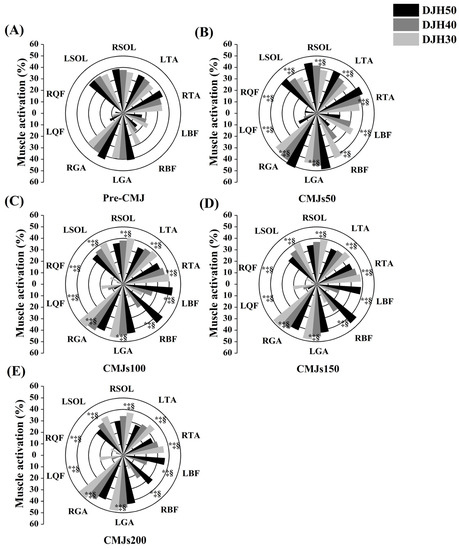 The experimental results show (Figure 4, Table S10) the muscle activation in the CMJ push-off phase. A significant difference was observed between the three jump heights in CMJs50, CMJs100, CMJs150 and CMJs200 (all p < 0.05). The right and left TA, SOL, QF and GAS muscle activation during CMJs50 at DJH50 was greater than at DJH40 and DJH30 (all p < 0.008; ES = 0.3–1.2). The post hoc comparison showed that the right and left TA, SOL, QF and GA muscle activation during CMJs100, CMJs150 and CMJs200 at DJH50 was smaller than at DJH40 and DJH30 (all p < 0.007; ES = 0.2–1.3). The post hoc comparison showed that the right and left BF during CMJs50 at DJH50 was smaller than at DJH40 and DJH30 (p < 0.01; ES = 0.2–0.9). The post hoc comparison showed that the right and left BF in CMJs100, CMJs150 and CMJs200 at DJH50 was greater than at DJH40 and DJH30 (p < 0.001; ES = 0.3–1.2). There was no significant difference in pre-CMJ between the three jump heights (p > 0.05).