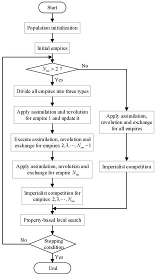 The ICA is constructed by simulating sociopolitical behaviors. It is made up of initialization, initial empires, assimilation, revolution, and imperialist competition. Unlike other meta-heuristics [31,32,33], the ICA has some characteristic features, which are a good neighborhood search ability, an effective global search property, and a good convergence rate [34].