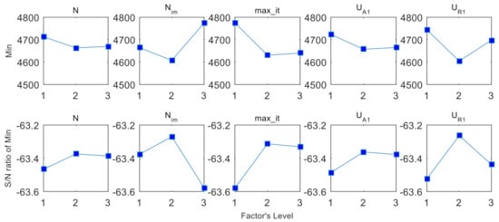 The HICA ran 20 times for an instance of Problem Combination 14. the orthogonal array was executed. The results of the and S/N ratio are shown in Figure 2. The S/N ratio is defined as , where denotes the best solution obtained in 20 runs. As shown in Figure 2, the best settings were , , , , .