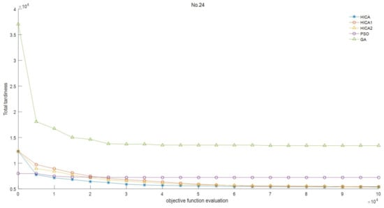 Table 3, Table 4, Table 5 and Table 6 describe the computational results of the HICA, the two variants, and the two comparative algorithms, in which data highlighted in bold are results of HICA being better than any other algorithms. The Wilcoxon test was performed, and the corresponding results are shown in Table 7. The box plots of all algorithms are given in Figure 3. The convergence curves of all algorithms on Combinations 24 and 76 are listed in Figure 4 and Figure 5.