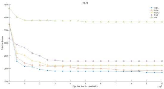 It can be found from Table 3, Table 4, Table 5 and Table 6 that the HICA performed better than its two variants on the three metrics. The HICA produced better than HICA1 on 65 combinations; the of HICA1 was less than that of the HICA on 37 combinations; the HICA had a smaller than HICA1 on 69 combinations. Obviously, the HICA had better convergence performance than HICA1, and the inclusion of the local search really improved the performance of the HICA. HICA2 could not generate better results than the HICA on most of the instances and was superior to the HICA on a limited number of instances. In the HICA, assimilation was implemented differently in different types of empires. The comparison between the HICA and HICA2 really proved the effectiveness of the diversified assimilation. Table 7 reveals that the HICA had a better , and than HICA1 and HICA2 in the statistical sense and produced a similar as its two variants; this conclusion also can be seen from Figure 3, Figure 4 and Figure 5. Thus, it is necessary to add the local search and the diversified assimilation to the HICA.