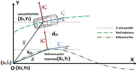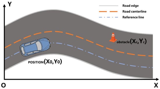 Consider the driving scenario shown in Figure 1, where the vehicle is expected to drive along the center line of the current lane (i.e., the reference line in Figure 1). A human driver will adjust the distance between the vehicle and the reference line during the driving process with his perception and experience, and an AV will be expected to control the vehicle in the same manner as a human driver when performing a same driving task. A Cartesian coordinate system can be established with reference to the orientation of the road to specify the vehicle’s position ( X 0 ,     Y 0 ) . However, it is complicated to evaluate the deviation of the vehicle from the reference line in the Cartesian coordinate system, and it is not well adapted for curved roads.