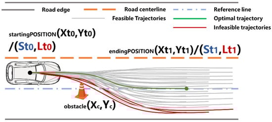 For the lateral motion of the vehicle, the lateral states of vehicles in a planning period can be defined as   { d t 0 ,   d t 0 ˙ ,   d t 0 ¨ ,   d t 1 ,   d t 1 ˙ ,   d t 1 ¨ } , where d t 0 and d t 1 represent the starting lateral position and the ending lateral position of the vehicle, respectively. d t 0 ˙ and d t 1 ˙ denote the starting lateral velocity and the ending lateral speed of the vehicle, respectively. d t 0 ¨ and d t 1 ¨ represent the starting lateral acceleration and the ending lateral acceleration of the vehicle, respectively. The motion planning problem can be transformed into a constrained functional extremum solution problem as shown in Equation (10).