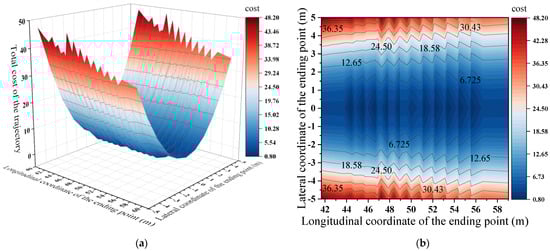 Figure 5. Costs of all trajectories in a sampling space without obstacles: (a) three-dimensional costs of all trajectories in a sampling space in the no-obstacle case; (b) contour projection of the costs of all trajectories in a sampling space in the no-obstacle case.