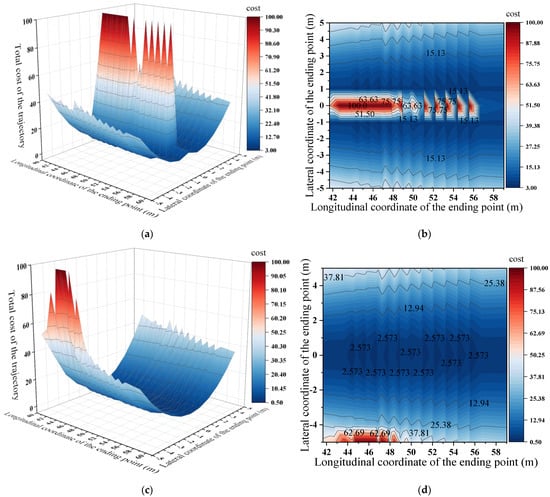 Figure 6. Costs of all trajectories in a sampling space with obstacles: (a) three-dimensional costs of all trajectories in a sampling space with an obstacle in front of the AV; (b) contour projection of the costs of all trajectories with an obstacle in front of the AV; (c) three-dimensional costs of all trajectories in a sampling space with an obstacle in front of the adjacent lane of the AV; (d) contour projection of the costs of all trajectories with an obstacle in front of the adjacent lane of the AV.