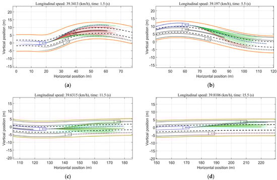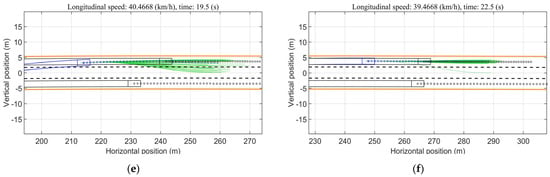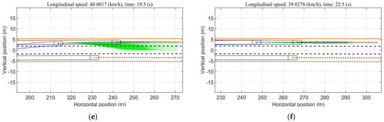 Figure 8. Performance of the AV when applying Method A: (a) the AV was planning a lane change to the left and overtaking with a maintain speed command; (b) the AV was planning for overtaking and then returning to the original lane with the maintain speed command; (c) the AV was maintaining the current speed in the current lane with the maintain speed command; (d) the AV was changing to the left lane with a lane changing command; (e) after completing a lane change to the left, the AV was maintaining its current speed in the left lane; (f) the AV was following the vehicle in front with the following command.
