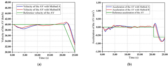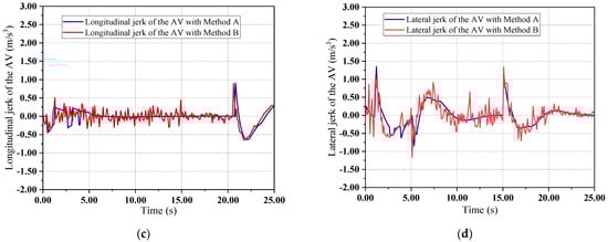 Figure 11. Speed properties of the AV in the two experiments: (a) velocity of the AV in the two experiments; (b) acceleration of the AV in the two experiments; (c) longitudinal jerk of the AV in the two experiments; (d) lateral jerk of the AV in the two experiments.