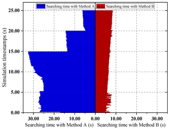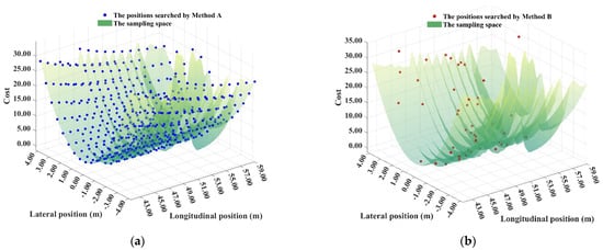 Figure 12. The process of searching for optimal trajectories: (a) the process of searching for optimal trajectories in the first planning period at t = 0 with Method A; (b) the process of searching for optimal trajectories in the first planning period at t = 0 with Method B.
