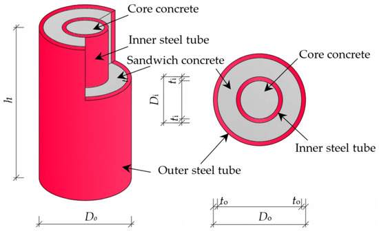 To study the axial compression behavior of symmetrical full-scale CFDST stub columns, 19 specimens were designed by considering the slenderness ratio (λ), the axial compression strength of the core and sandwich concrete (fcki, fcko), the thickness (ti, to), and the yield strength (fcki, fcko) and diameter (Di, Do) of the inner and outer steel tubes as the main controlled parameters. These specific parameters are shown in Table 1 and the sketch of the CFDST columns is shown in Figure 2. The constraint effect coefficients (ξi, ξo) [28], which stood for the constraint effect of the core concrete and sandwich concrete, respectively, were listed in Table 1. According to the failure mode of the CFST columns [29], the sandwich concrete was constrained by the outer steel tube, and the only interaction between the inner steel tube and sandwich concrete was the interfacial bonding. During the loading process, it was almost impossible to achieve a synchronous deformation between the inner steel tube and sandwich concrete [30]; therefore, the interfacial bonding effect would disappear when the circumferential expansion was very small. To conclude, the interfacial bonding effect between the inner steel tube and sandwich concrete may be ignored during the calculation process of ξo, as shown in Equation (1). The strength of the inner steel tube and core concrete is simplified with fcko: