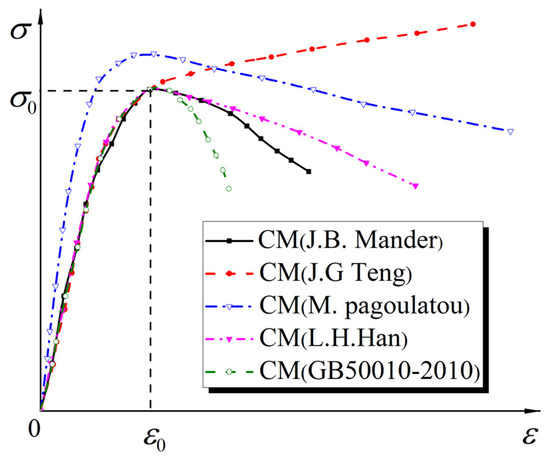 Multiple constitutive models (CMs) for confined concrete have been proposed by many scholars, such as J. B. Mander [11], J. G. Teng [21], M. Pagoulatou [22], and L. H. Han [28], as shown in Figure 3. Additionally, the CM curve of unconfined concrete provided by GB50010-2010 [31] is shown in Figure 3. By comparing the different CMs for confined concrete, L. H. Han’s CM was selected in the present paper to simulate the damage state of concrete.