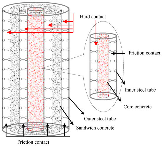 The finite element model of the CFDST specimens was established using ABAQUS software. The eight-node three-dimensional solid element (C3D8R) was adopted to simulate the steel tubes and concrete. The interfacial contact between the steel tubes and concrete consisted of hard contact in a normal direction and friction contact in a tangent direction. It would be possible for the interface between the steel tube and concrete to transfer the shear stress (τ) [32], if τ was not greater than the critical value of the interface bond stress (). On the contrary, the relative slip would occur between the steel tube and concrete if τ was greater than , as shown in Equation (4). The relative slip between the steel tube and concrete is considered in the present paper. The interfacial contact of the CFDST specimens is shown in Figure 4:
