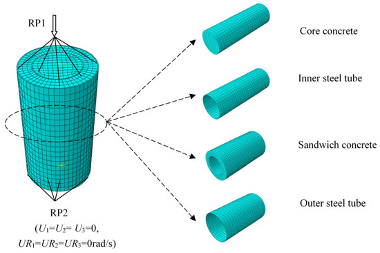 The two reference points (RP1 and RP2) were established with the distance of 10 mm outward from two ends, respectively. In order to ensure that specimens could be subjected to a uniform axial compression load, RP1 and RP2 were coupled with the top and bottom surfaces of the specimens, respectively. Both displacements and rotations of RP2 were constrained to realize the consolidation for the bottom surface of the CFDST stub columns, which could restrict the displacements of the X, Y, and Z directions (U1, U2, and U3), as well as the rotations of the X, Y, and Z directions (UR1, UR2, and UR3). The vertical displacement was applied to the RP1 point of the specimens. During the process of assembly, the models were divided into four equal parts along the circular section. In order to guarantee the mesh quality and calculation accuracy, each component should be divided into 3 layers in the lateral direction, at least. As for the mesh size (MS) of the concrete, the difference should not be too great in the three directions. It can be suggested that the shape of the element mesh should be a hexahedron, and the mesh and boundary conditions are shown in Figure 5: