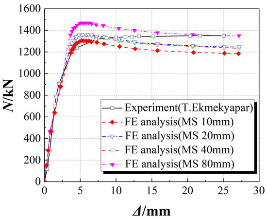 To verify the rationality of the modeling method developed in this paper, 26 similar experimental specimens [24,25] were selected, and 26 corresponding FE specimens were carried out based on the above modeling method. The dimensions and material properties of the experimental specimens are summarized in Table 2. The meshing had a significant impact on the results of the finite element calculation, so it was necessary to adopt a suitable mesh size. Firstly, perform a calculation using a large mesh size, and subsequently conduct the calculation again using half of the original mesh size. By comparing the results of the two calculations, if the calculation error is within 2%, the mesh size can be regarded as meeting the requirements. Otherwise, the mesh should continue to be subdivided until the requirements are met. Taking the CC1-SC1-OT1 specimen as an example, the comparisons of modeling using different mesh sizes is shown in Figure 6. From the comparisons between the simulations and experiments, it was found in Figure 6 that it was better simulate 20 mm as the mesh size. In this paper, the average mesh size for the concrete and steel tubes of the reduced-scale specimens was 20 mm, while that of the full-scale specimens was 50 mm.