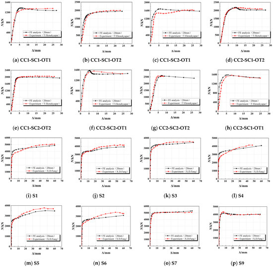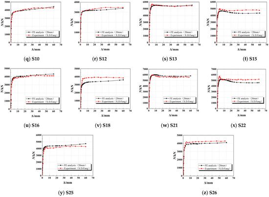 The FE analysis of 26 specimens was carried out by adopting the above modeling method. The N–Δ curves can be obtained, as shown in Figure 7. It can be seen that all of the results are in agreement for the majority of the specimens; however, when the specimens are in the plastic stage, the agreement of the results between the FE analysis and the experiment is poor. The reason for this is that the concrete was regarded as an isotropic continuous element during the simulation analysis process, while the concrete belonged to the discrete element in the experiment. The axial compression bearing capacity ( and ) obtained by experimental means and the FE analysis are shown in Table 2 and Figure 8. The maximum error (ErrorMax) between them was 9.70%, and it can be seen that the simulation accuracy is so great that it can meet the requirements of practical engineering. The failure modes of all specimens were essentially similar to the experiment, and 2 representative specimens (CC2-SC1-OT1 and S7) were given, as shown in Figure 9.