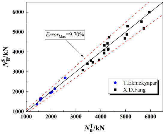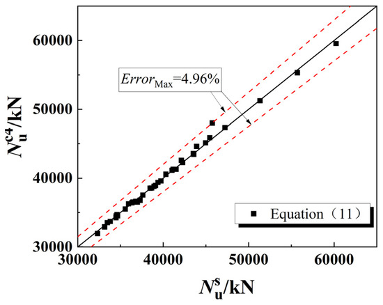 The axial compression bearing capacity () of 42 full-scale specimens, calculated using Equation (11), is shown in Figure 18. It can be seen from Figure 18 that the maximum error (ErrorMax) between and is 4.96%, and both figures are in good agreement. It can be seen that Equation (11) has a high calculation precision, which can meet the requirements of practical engineering.
