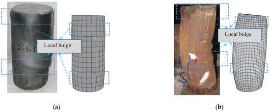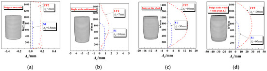 Deformation process of S1 and CF2: (a) bulge at two ends for specimens; (b) bulge at the mid-section for specimens; (c) bulge at the whole for specimens; and (d) bulge at the whole with great Δc for specimens.