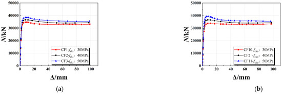 The N–Δ curves of full-scale specimens with different strengths of core concrete (fcki) and sandwich concrete (fcko) are listed in Figure 10. In Figure 10a, it can be seen that when fcki is assigned the different values of 30 MPa, 40 MPa, and 50 MPa, the of full-scale specimens can be improved from 34,671.90 kN to 36,578.70 kN and 38,478.20 kN, respectively, which increases by 5.49% and 10.98%. In Figure 10b, it can be seen that when fcko is assigned the different values of 30 MPa, 40 MPa, and 50 MPa, the of full-scale specimens can be improved from 33,811.60 kN to 36,578.70 kN and 39,392.80 kN, respectively, which increases by 7.56% and 15.26%. Therefore, can be improved with the increase in fcki and fcko, but it is noted that fcko, significantly, has a more important impact on improving than fcki.