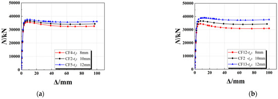 The N–Δ curves of specimens with different thicknesses of inner () and outer () steel tubes are listed in Figure 11. In Figure 11a, it can be seen that when is assigned the different values of 8 mm to 10 mm and 12 mm, the of specimens can be improved from 35,410.30 kN to 36,482.40 kN and 37,625.30 kN, respectively, which increases by 3.03% and 6.26%. In Figure 11b, it can be seen that when is assigned the different values of 8 mm, 10 mm, and 12 mm, the of specimens can be improved from 34,478.00 kN to 36,578.70 kN and 38,930.40 kN, respectively, which increases by 6.09% and 12.91%. Therefore, can be improved by increasing and . It is noted that can be improved by more significantly than .