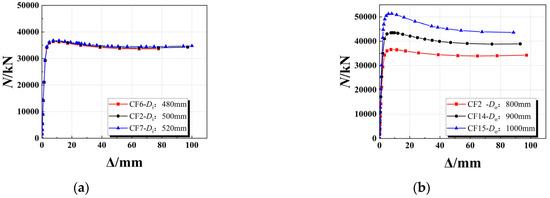 The N–Δ curves of the specimens with different diameters of core concrete () and sandwich concrete () are listed in Figure 12. In Figure 12a, it can be seen that the increase in has little influence on improving ; on the contrary, the load-holding behavior of the CFDST can be significantly improved. In Figure 12b, it can be seen that when Do is assigned the different values of 800 mm, 900 mm, and 1000 mm, the of the specimens can be improved from 36,578.70 kN to 43,521.30 kN and 51,334.50 kN, respectively, which increases by 18.98% and 40.34%. Therefore, can be improved more significantly by increasing , while the ductility gradually decreases with the increase in , and the performance is similar to the CFST columns.