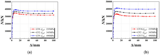 The N–Δ curves of specimens with different strengths of the inner steel tubes (fyki) and outer steel tubes (fyko) are listed in Figure 13. In Figure 13a, it can be seen that when fyki is assigned the different values of 235 MPa, 345 MPa, and 490 MPa, the of specimens can be improved from 34,596.20 kN to 36,578.70 kN and 39,105.00 kN, respectively, which increases by 5.73% and 13.03%. In Figure 13b, it can be seen that when fyko is assigned the different values of 235 MPa, 345 MPa, and 490 MPa, the of specimens can be improved from 33,148.20 kN to 36,578.70 kN and 41,168.10 kN, respectively, which increases by 10.35% and 24.19%. Therefore, can be improved by increasing fyki and fyko. It is noted that fyko can improve more significantly than fyki.