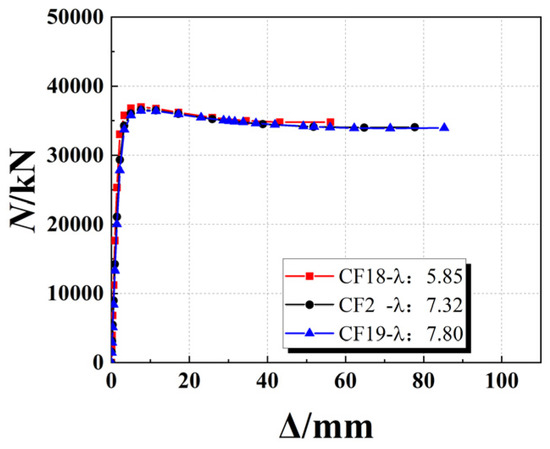 The N–Δ curves of specimens with different slenderness ratios () are listed in Figure 14. It can be seen from Figure 14 that when is assigned the different values of 5.85, 7.32, and 7.80, the of specimens decreases from 36,978.60 kN to 36,578.70 kN and to 36,465.80 kN, respectively, which decreases by 1.08% and 1.39%. On the contrary, the ultimate displacement increases from 56.12 mm to 77.75 mm and to 85.28 mm, and the growth rate is 38.54% and 51.96%, respectively. Therefore, decreases gradually with the increase in , but the ultimate displacement significantly improves.