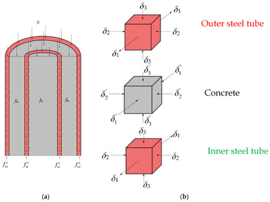 The Poisson’s ratios of the steel tubes and concrete will continuously change during the loading process. Initially, < , so is greater than , and it is impossible for the steel tubes to provide a constraint effect for the concrete. When the longitudinal compression stress of the steel tubes reaches its proportional limit (i.e., ≈ ), approximately equals , so approximately equals . When N gradually increases, > , that is, is smaller than . The lateral expansion of the concrete is constrained by the steel tubes, and it means that the constraint effects are functioned. The stress distribution of the symmetrical CFDST stub columns is shown in Figure 15a, where and are the radial pressures provided by the core and sandwich concrete, respectively. Both and are the circumferential forces provided by the inner and outer steel tubes, as shown in Equation (6). Both steel tubes and concrete are under the state of tri-axial compression stress. The longitudinal, radial, and circumferential stresses (, , , , , and ) of the inner and outer steel tubes and concrete are presented in Figure 15b as the following: