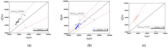 Comparisons between and of specimens: (a) calculated using Equation (7); (b) calculated using Equation (8); and (c) calculated using Equation (9).