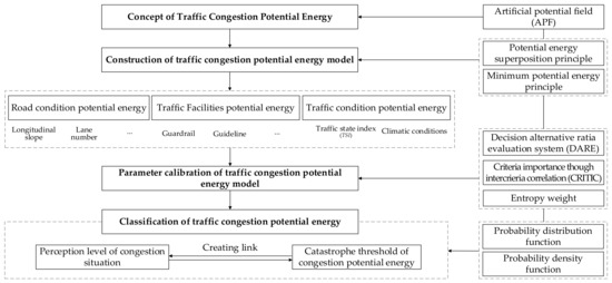 Potential energy is one of the most important concepts in physics. It originated from the word “potentiality”, which was proposed by Aristotle, the ancient Greek philosopher. It has three meanings: the origin, root, or power of motion change; the logical possibility; and the potential ability of objects to change their motion [27,28]. The term potential energy was first coined by William Rankine, a Scottish physicist in the 19th century. He believed that all forms of energy could be divided into two categories: real, perceived energy—kinetic energy, and potential energy. Here, potential energy represents the tendency of a substance to move under certain conditions and can be measured by the work conducted by the matter overcoming force [29,30,31]. That is, potential energy is equal to the potential, trend, or energy of the work of the object. The greater the potential energy is, the greater the potential, trend, or energy to do work will be, which is in agreement with conservation law. The artificial potential field (APF) is a virtual force method proposed by Professor Oussama Khatib of Stanford University’s Intelligent Robot Laboratory in the mid-1980s. It simplifies the motion mechanism of robot by abstracting the motion of the robot in a certain environment, such as the attraction of the target point to the robot and the repulsion of the obstacles in the surrounding environment to the robot [32,33]. Considering that vehicles in a certain environment also have the potential to drive at fast speeds or decelerated braking, the level of congestion is also relative to the amount of work conducted by the forces amongst people, vehicles, and roads, and the acceleration or braking of the vehicle is mainly affected by the driver’s perception of the hidden dangers of the road environment [34,35]. Therefore, potential energy theory can be introduced into the study of traffic congestion to reflect potential congestion trends. At the same time, the mechanism between the various components of the traffic system can be simplified by an analogy of the artificial potential field method in order to provide a new perspective and new ideas for the study of congestion identification methods.