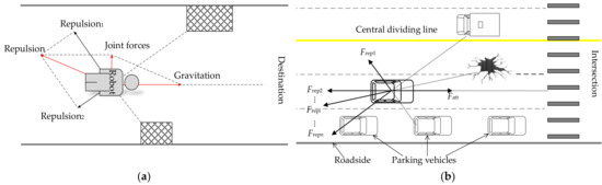 Schematic of robot force in APF and vehicle force in road system. (a) Robot in APF, (b) vehicle in road system.