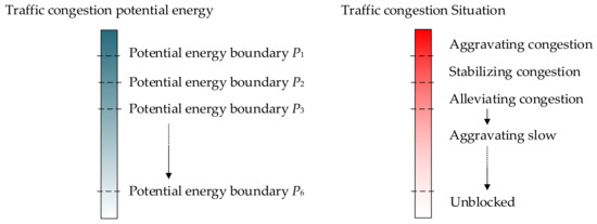 The congestion state can be divided into three levels: unblocked, slow, and congested. Congestion trends can be divided into three types: aggravation, alleviation, and stable [19,24]. Therefore, this study divides the traffic congestion situation into seven levels according to its severity and change trends: aggravating congestion, stabilising congestion, alleviating congestion, aggravating slow, stabilising slow, alleviating slow, and unblocked. A mapping relationship exists between the conversion boundaries of each level and the traffic congestion potential energy value. Thus, the traffic congestion potential energy can also be divided into seven levels. The mapping relationship between traffic congestion potential energy and the traffic congestion situation is shown in Figure 3.