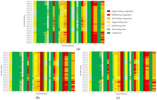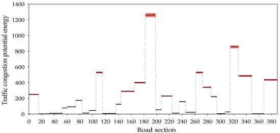 As shown in Figure 10, the congestion potential energy of adjacent sections in the study area is highly correlated, and the congestion potential energy between different sections is significantly different. Particularly, the average congestion potential energy of Section 183–198 (Baojian Road (West–East)) is high, and the standard deviation is large, followed by Section 316–328 (Yanxing Road (West–East)). This result may be due to the schools, residential areas, and the Second Affiliated Hospital of Harbin Medical University on the west to east side of the Baojian Road. Particularly, the Second Affiliated Hospital of Harbin Medical University integrates medical treatment, teaching, and rehabilitation and is one of the best hospitals in Heilongjiang Province. The traffic demand is high regardless of weather, holidays, and other factors, but the parking spaces inside the hospital are insufficient. Moreover, vehicles often cannot enter, return, or directly occupy a lane for parking. Since there are four lanes on this side of the road and parking spaces and bus stops are present on the side of the road, the traffic pressure on this side of the road is high, the anti-interference ability is poor, and the possibility of congestion is high. As the main road, Yanxing Road only has two lanes on the west to east side. The land along the road is mainly used by residential communities and schools. To improve the convenience of residents, 17 entrances and exits have been set up on this side of the road with a length of 1.9 km, which is far more than the 2–3 km [71] specified in the ‘Urban Comprehensive Transportation System Planning Standard’ (GB/T51328-2018), which not only affects the normal running of vehicles on trunk roads but also the operation of adjacent lanes when vehicles slow down and change lanes, thereby creating a great possibility of congestion. Particularly, the dispersion degree of the congestion potential energy is the highest during the commuting and school periods.
