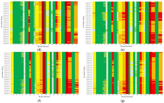 Many indicators can reflect traffic conditions, among which speed can best reflect the effect of traffic conditions on drivers [53]. Since the road section may contain intersections, if the vehicle speed of the stop light is directly used for representation, then the result may be inaccurate. Therefore, this study chooses the TSI, which takes the actual speed and free-flow speed as the core calculation parameters, as one of the indicators to reflect the potential energy of traffic conditions, and the calculation formula is shown in Equation (7). The greater the value of is, the greater the potential energy of the traffic conditions will be.