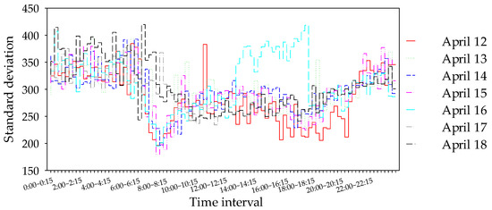 As shown in Figure 9, the potential energy value of traffic congestion in the study area fluctuates greatly throughout the entire day. Particularly, the fluctuation degree of the traffic congestion potential energy is similar in the whole range of 0:00–5:30, and the change is relatively stable. Between 5:30–9:00m, although the degree of dispersion has decreased, the degree of volatility is intense, which may be due to the congestion in the time related, the current congestion situation, and the subsequent congestion situation having a greater correlation, and the degree of dispersion is smaller. At the same time, the amount of travel in this period is large, and travel increases sharply during the peak commuting period, which then decreases sharply; thus, the fluctuation is large. After that, the traffic congestion potential fluctuations between 17:00–19:00 after experiencing steady changes; however, the fluctuation degree is smaller than the early peak. In addition, the congestion potential on Saturday (April 17) and Sunday (April 18) is significantly different from that on weekdays, and the overall congestion potential on Monday (April 12) and Tuesday (April 13) is higher than that on Wednesday and Friday. Notably, the fluctuation of the congestion potential energy rises sharply at about 13:00 on April 16, which is related to the snowfall. Therefore, the identification results obtained by the proposed method in this study are consistent with the actual situation in time.