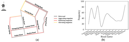 To make the verification results more convincing, statistics are made on the road sections in a congestion situation. Particularly, there are 38 congestion alleviating roads, namely Xidazhi Street (South–North), Xidazhi Street (North–South), Yanxing Road (East–West), and Qinghua Street (East–West); 96 road stabilising congestion sections, namely Jiankang Road (East–West), Zhongxing Street (East–West), Hexing Road (East–West), Haxi Street (North–South), Qinghua Street (West–East), Zhengyi Road (South–North), and Wenchang Street (South–North); and 109 aggravating congestion road sections, namely Xuefusi Street (West–East), Haping Road (South–North), Baojian Road (West–East), Fudan Street (East–West), Yanxing Road (West–East), Xuefu Road (South–North), and Hexing Road Auxiliary Road (West–East), as shown in Figure 11a. To obtain the real congestion data, a questionnaire about the congestion sections and congestion time in Harbin (according to their own understanding) was distributed to the citizens of Harbin, and the data related to the congestion roads and congestion frequency in the study area were obtained by means of investigation, the traffic management department, and traffic broadcast information collection, as shown in Figure 11b. By comparing the experimental and field survey results, the proposed method is generally consistent with the real situation in space.