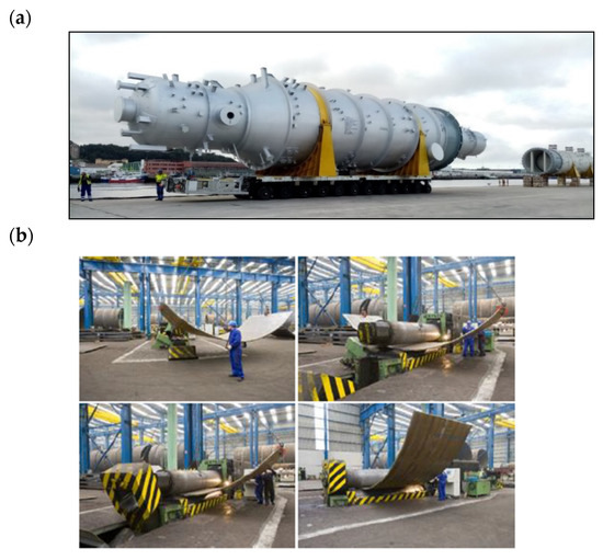 To perform the simulation, the reference pipe component is shown in Figure 1a. The forming process, Figure 1b, consists of the selected stages of manufacturing of cans with the received base material (metal plates). This process is carried out with a three-roller bending machine and consists of performing several roll-bending sequences in an iterative process. It starts by inserting the end of the plate in the three-roller bending machine with the help of a gantry, ensuring that it is centred regarding the rollers. Then, pressure is applied with the upper roller over the plate that relies on two rollers to prevent the plate from coming loose. This operation is repeated until the curvature complies with the curvature tolerances, verified by the worker with a template.