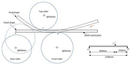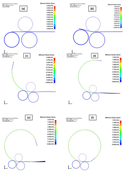 The FE model assembly is shown in Figure 5, and the various steps of the roll bending process obtained by numerical calculation are shown in Figure 6. It is clear that the curvature distribution was asymmetrical approximately at the rear roll contact point (between the rear roll and the sheet).