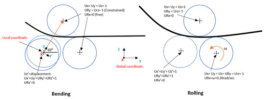 All loads and constraints were referenced to the global coordinate system and the local coordinate for the rear roller, as shown in Figure 4. The model was performed in two stages. One was the bending of the sheet metal, or just “bending”. The second stage was the circumferential bending of the sheet, referred to as “rolling”. Prescribed movements of the rigid bodies of the rollers were shown by the center point of the roller. Thus, the constraints and loads were applied to the centers of the rollers. The boundary conditions are shown in Figure 4. In the first stage, the top and front rollers were free to rotate at the global X-axis, while the rear roller was restricted to translating only along the Z’-axis of local coordinates at 60°. At the second stage, the front roller rotated. The speed provided by the front roller is 6.23 m/min (about ω = 2 rpm/min), while the top roller remained in the same state as defined in the earlier stage; after the rear roller is shifted, it is constrained to the z’-axis of local coordinate in the second stage.