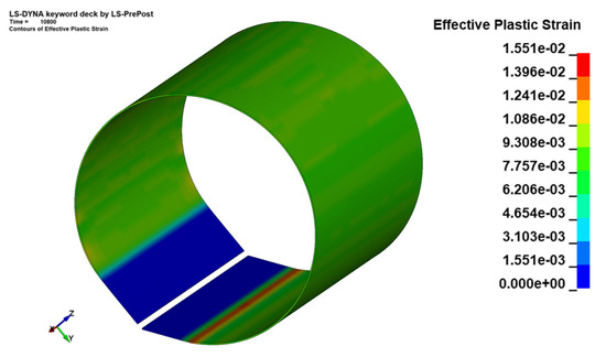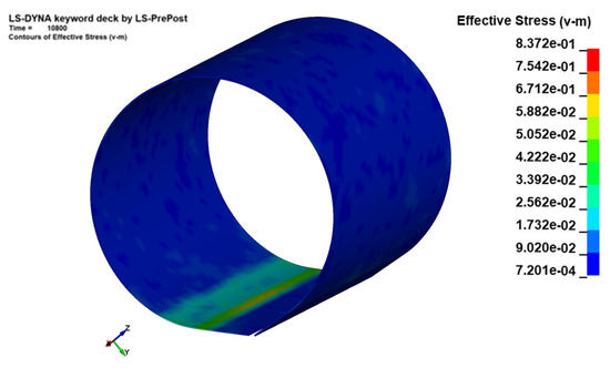 Figure 7 and Figure 8 show the distribution of residual stress and equivalent plastic strain generated during the forming process. The unit of measurement considered in this simulation is the GM unit (kg, mm, ms, KN, GPa, KN-mm). Therefore, the stress is expressed in GPa. The maximum stress obtained during the process was 0.837 GPa, and equivalent plastic strain was around 1.55% throughout the formed pipe.