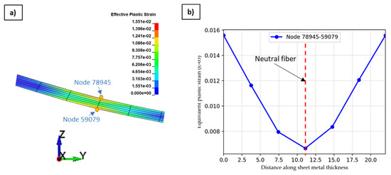 (a) Distribution of equivalent plastic strain along the sheet thickness which is bent. (b) Corresponding graph along the sheet thickness from node 59079 to 78945.
