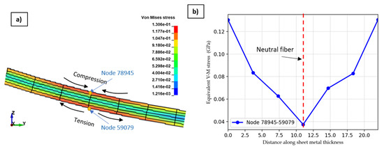 (a) Distribution of equivalent von Mises stress over a section of bend along the sheet thickness. (b) Corresponding graph along the sheet thickness from node 59079 to 78945.