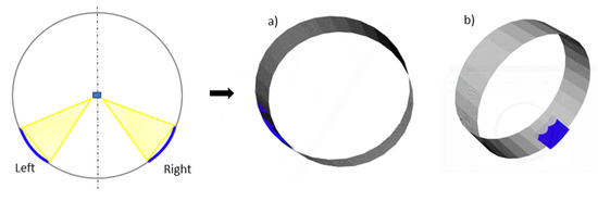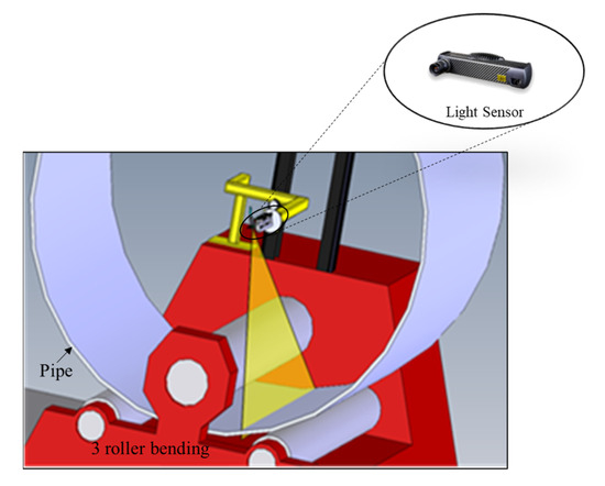 The aim of this system is to check the curvature of the can in the area near to the rollers, just as the operators do, as shown in Figure 12. The light sensor is connected in such a way that it capture the points at beginning of pipe curvature and throughout the process. However, in order to validate in a more efficient way, the two different map of the point cloud are captured for the curvature of the pipe at the beginning (first pre-bending) and at the end of pipe forming (last) to compare the symmetrical deviation in curvature measurement. The curvature is computed by calculating the fitting cylinder (gray) of the section acquired by the sensor (blue) during the experiment, as shown in Figure 13.