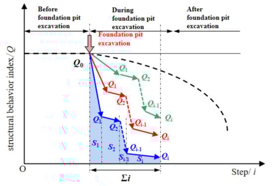 Due to the time effect of soil deformation, the block excavation with several steps of an adjacent foundation pit is beneficial to control the deformation of the existing tunnel. The evolution curves of structural behavior index Q versus steps i under different excavation plans of the foundation pit are displayed in Figure 1. Furthermore, the resilience index of tunnel lining R is proposed by ratio of the area (evolution curves of structural behavior index) to initial curve S0, as rendered in Equation (2):