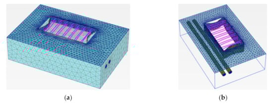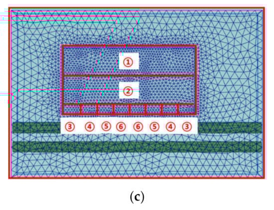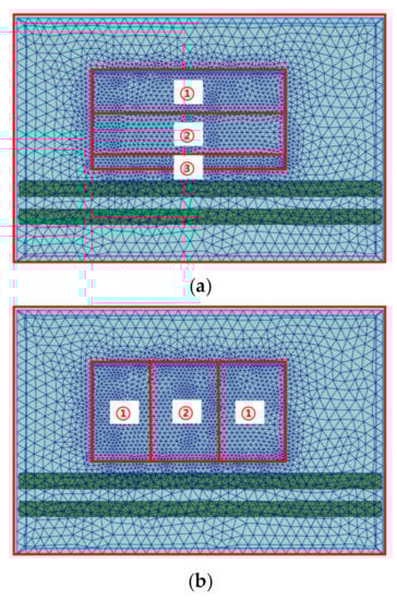 PLAXIS 3D is a widely used geotechnical engineering finite element software, which can simulate complex engineering geological conditions, structures and construction processes, especially suitable for deformation analysis. The overall model and relative position relation between a symmetrical excavation pit and existing tunnels are shown in Figure 2. The dimensions and meshes of the numerical simulation model are as follows: The length of the model is 150 m, the width of the model is 100 m, the height of the model is 50 m; the diameter of the tunnel is equal to the outer diameter of the cutter plate 6.2 m, and the depth of the stratum below the tunnel bottom is 12 m, as shown in Figure 2. The length direction of the foundation pit is 100 m, the width direction is 40 m, and the depth is 30 m. The foundation pit is only 3 m from the nearest point of the tunnel. In addition to the free surface at the top of the model, deformation constraints are applied around and at the bottom. The soil material in the calculation follows the Mohr–Coulomb failure criterion. Table 2 renders the soil parameters.