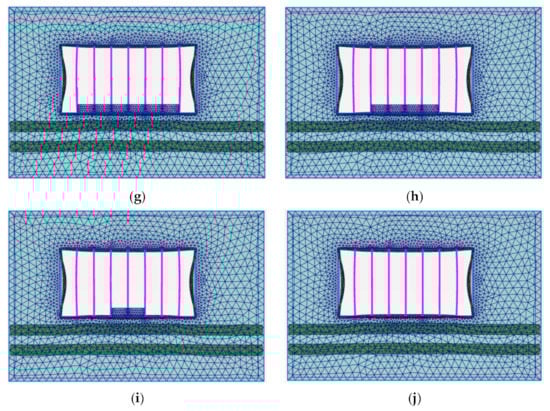 Contour of displacement response of existing tunnel under different steps (Scale = 30): (a) initial state; (b) tunnel excavation; (c) construction of retaining structure of foundation pit; (d) the first block in the first layer; (e) the second block in the first layer; (f) the third block in the first layer; (g) the fourth block in the first layer; (h) the fifth block in the first layer; (i) the sixth block in the first layer; (j) the seventh block in the first layer.