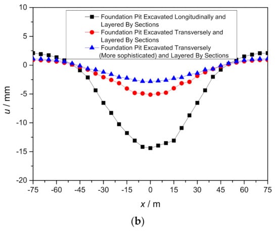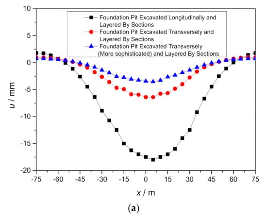 The traditional analysis method focuses on the longitudinal deformations of the existing tunnel when the foundation pit was excavated with three diagrams of the block symmetrical excavation of foundation pit, as shown in Figure 5. The results show that the longitudinal deformations of the existing shield tunnel linings vary greatly under different symmetrical excavation methods. When plan 1 is used to excavate the foundation pit, the longitudinal deformations of the existing shield tunnel lining increase the most. When plan 2 is adopted, the degree of the longitudinal deformations is second. When plan 3 is adopted, the longitudinal deformations of the existing shield tunnel lining increase to the minimum. Moreover, because the existing tunnel on the right line is far from the foundation pit, the longitudinal deformation variation trend of the existing tunnel on the right line under the three symmetrical excavation plans is lower than that of the existing tunnel on the left line.