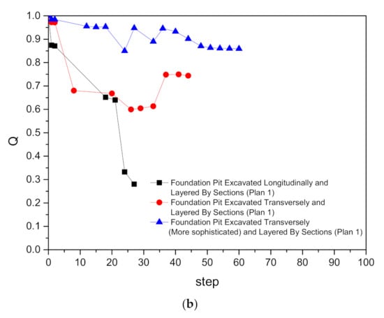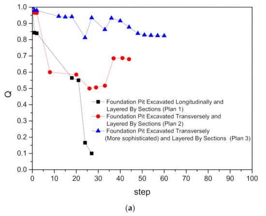 The evolution curves of structural behavior index Q versus steps i under different excavation plans of the foundation pit.